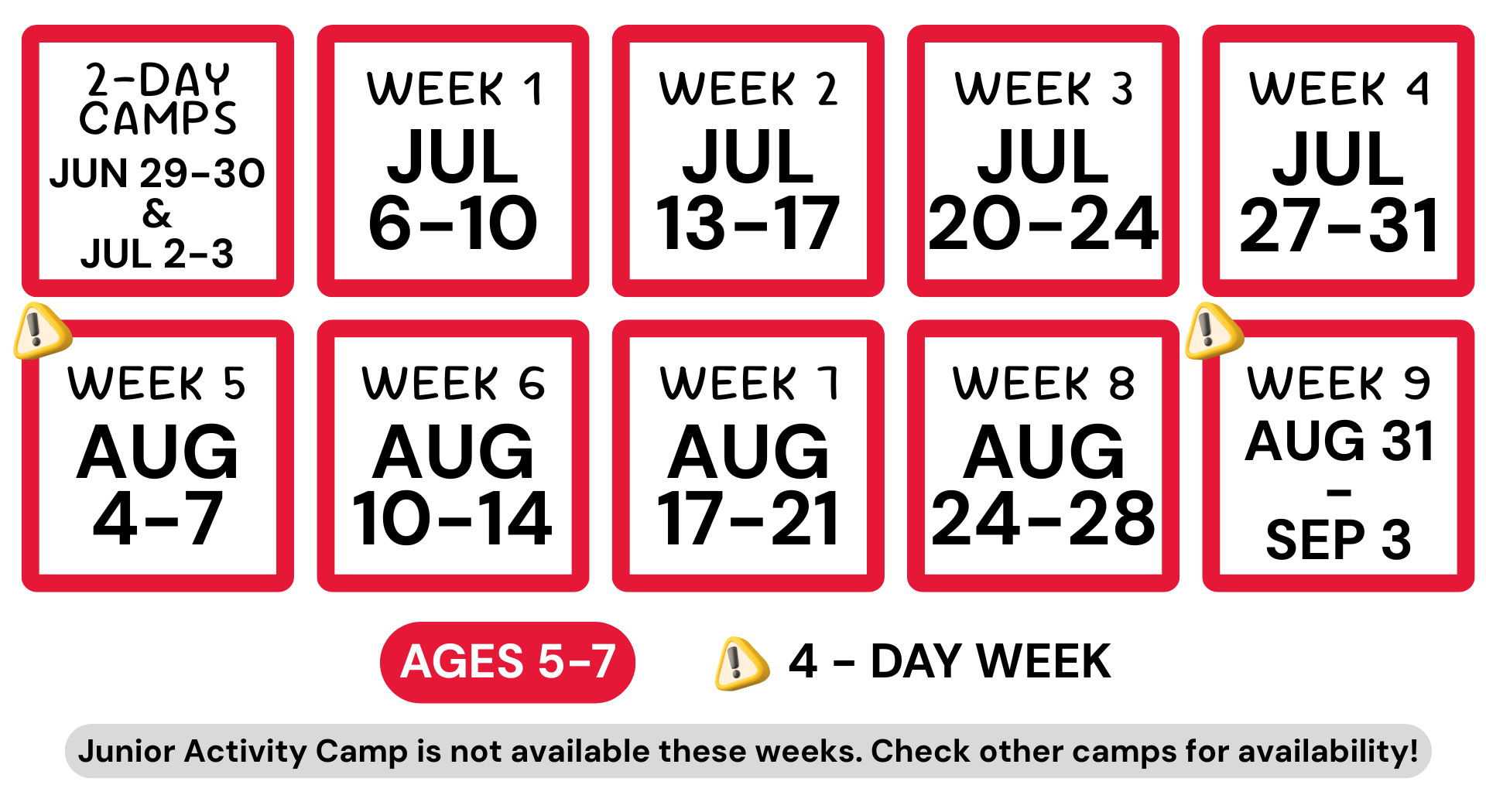 - Junior Activity Camp groups include 3 staff per 18 campers (1:6 ratio).