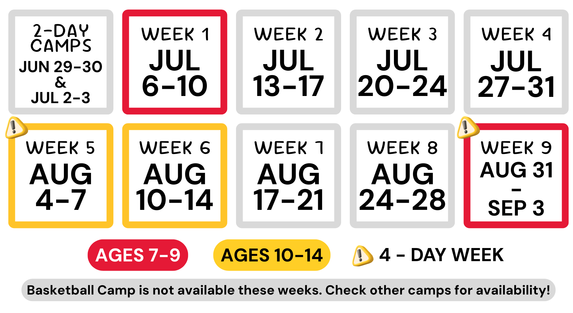 This program focuses on developing basic skills and technical abilities in a fun, supportive environment. Campers will build a strong basketball foundation, improve their skills, and learn the fundamentals of the game, catering to various ages and skill levels.