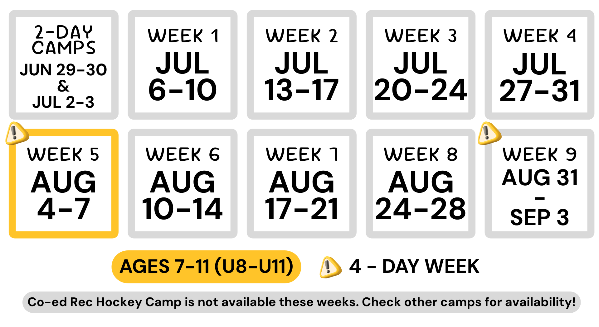 - Co-ed Hockey Camp includes 2 staff per 20 campers (1:10 ratio).