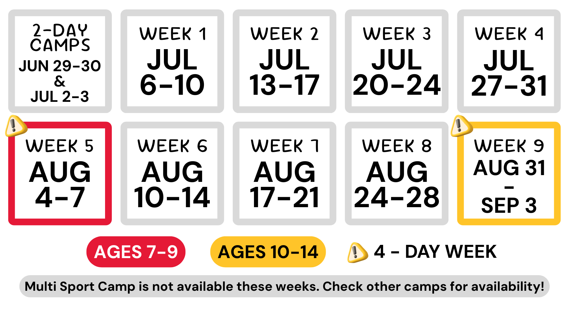 - Multi-Sport Camp includes 2 staff per 20 campers (1:10 ratio) for the 10-14 age group and 3 staff per 24 campers (1:8 ratio) for the 7-9 age group.