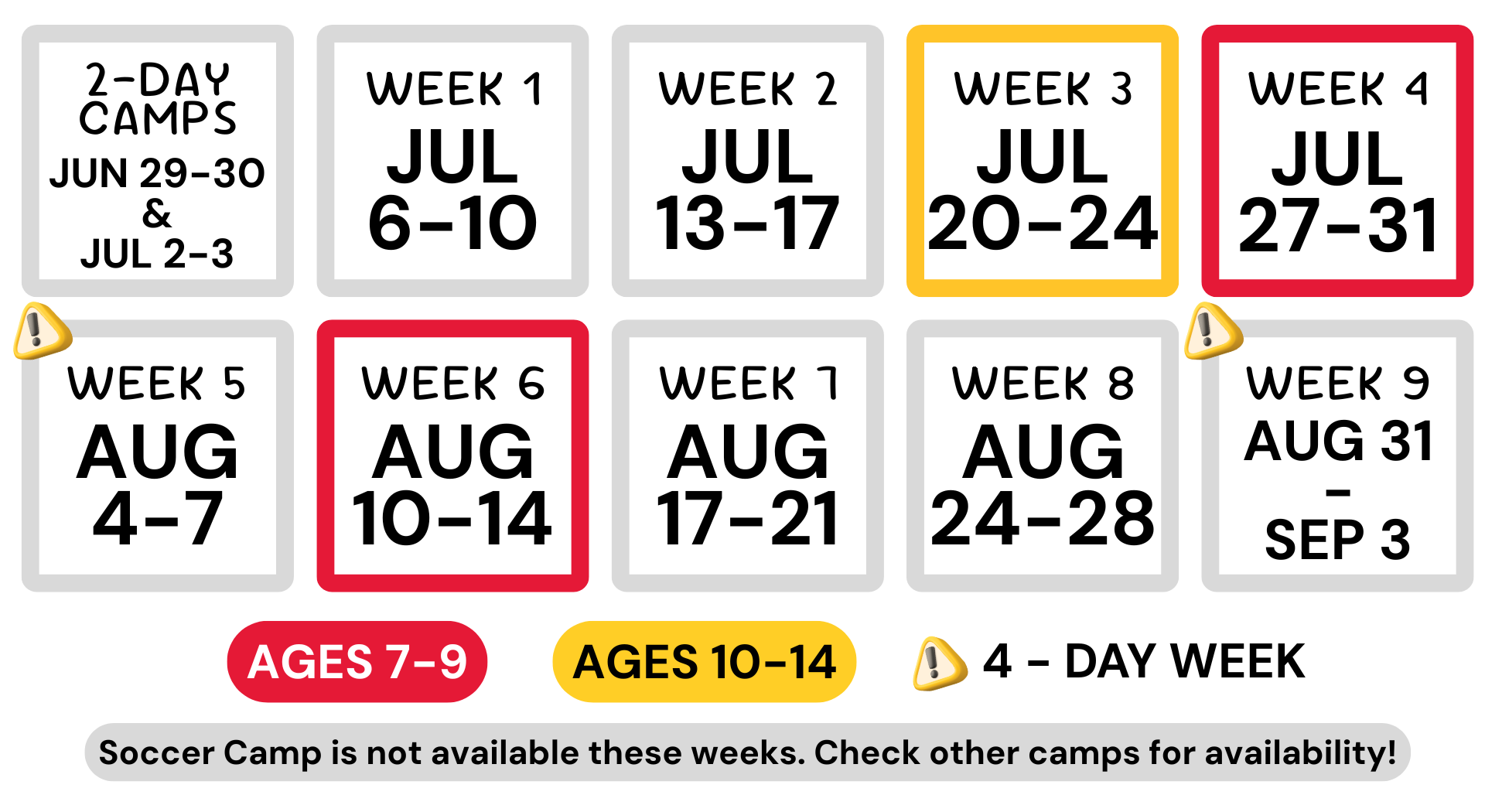 This program focuses on developing basic skills and technical abilities in a fun, supportive environment. Campers will build a strong soccer foundation, improve their skills, and learn the fundamentals of the game, catering to various ages and skill levels.