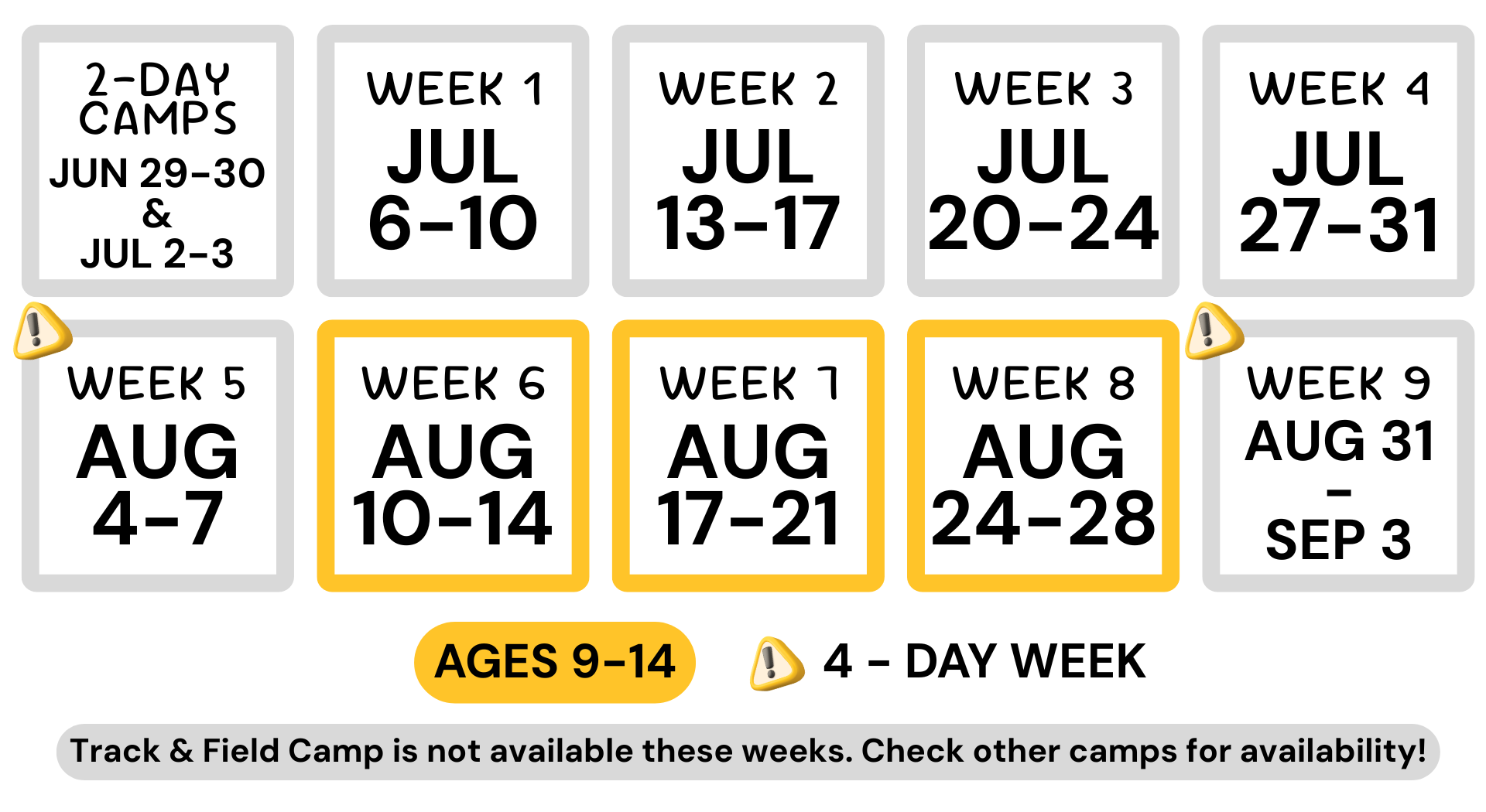 - Track & Field Camp includes 2 staff per 18 campers (1:9 ratio).