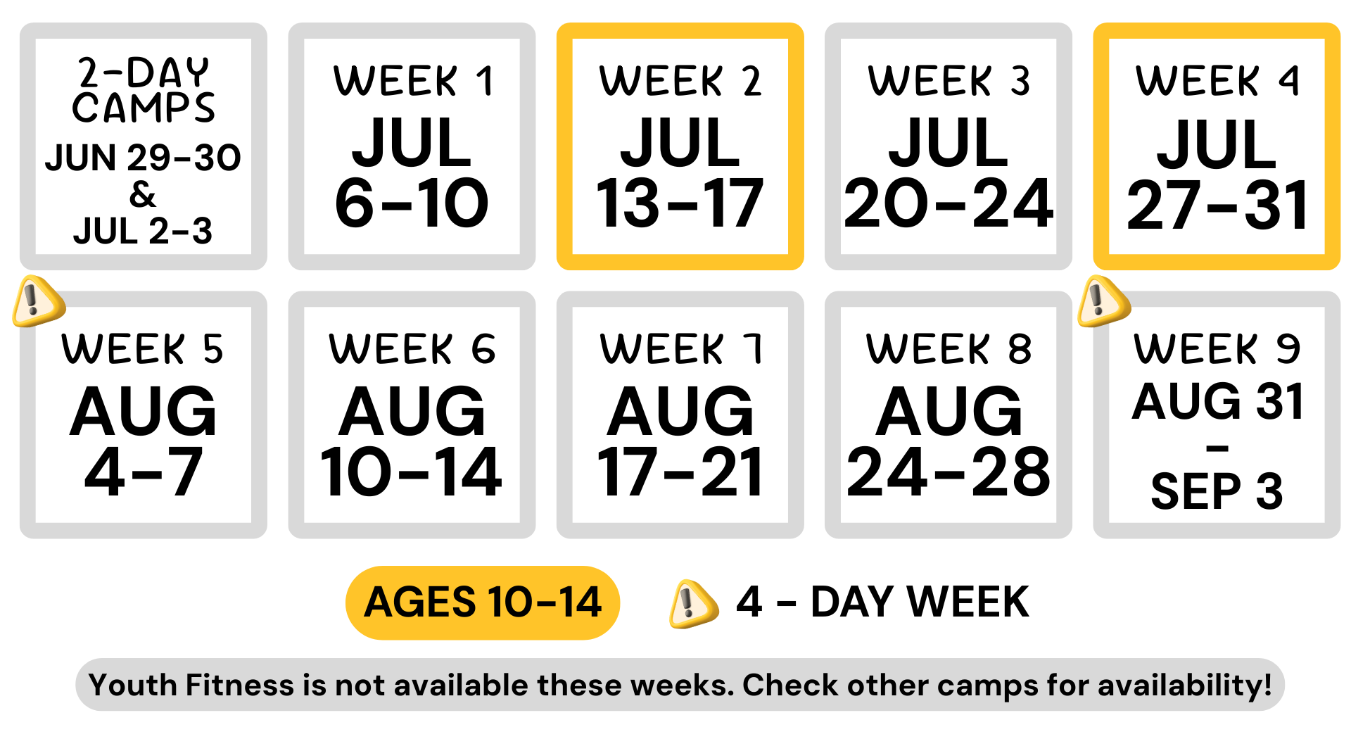 The Youth Fitness Camp program provides campers a unique and exciting fitness experience. With hands-on experience with fitness equipment, including cardio machines and strength equipment, and classes, campers will learn how to move their bodies in a safe, energetic environment.